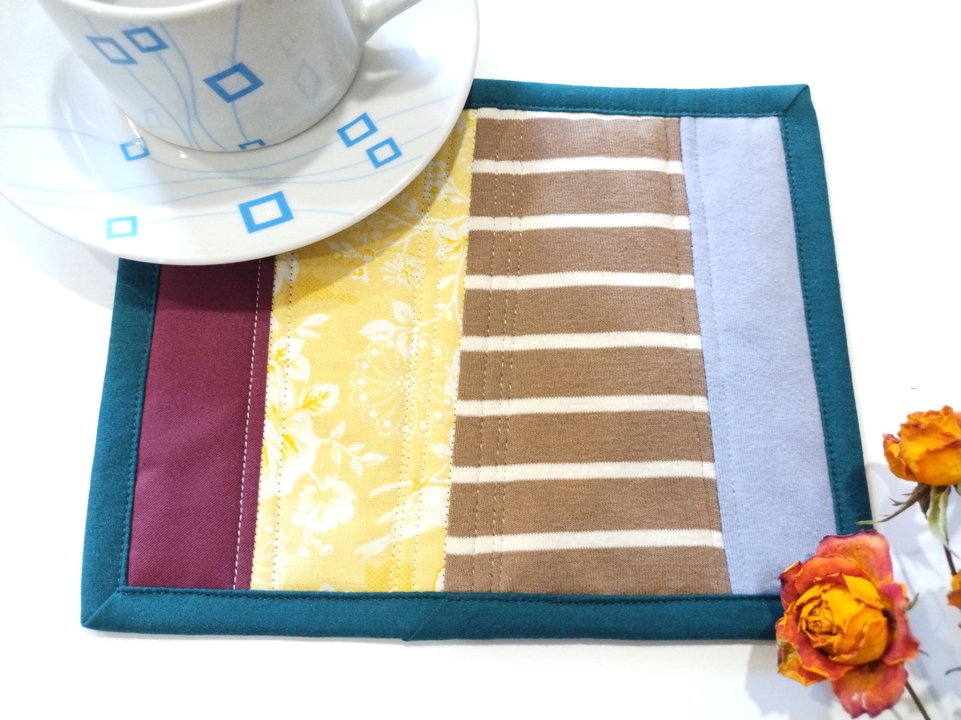 Simple, warm, and full of charm — the Harvest Porch Mug Rugs bring a touch of farmhouse coziness to your table. Made from reclaimed clothing in rich maroon, sunny floral yellow, soft sky blue, and classic brown stripes, these quilted mats feel like a morning spent on a country porch. Their sturdy stitching and soft, worn fabrics make them perfect for protecting your table while adding a welcoming, homespun feel to your kitchen or coffee nook. Each one is a little piece of farm life, crafted with care and love.