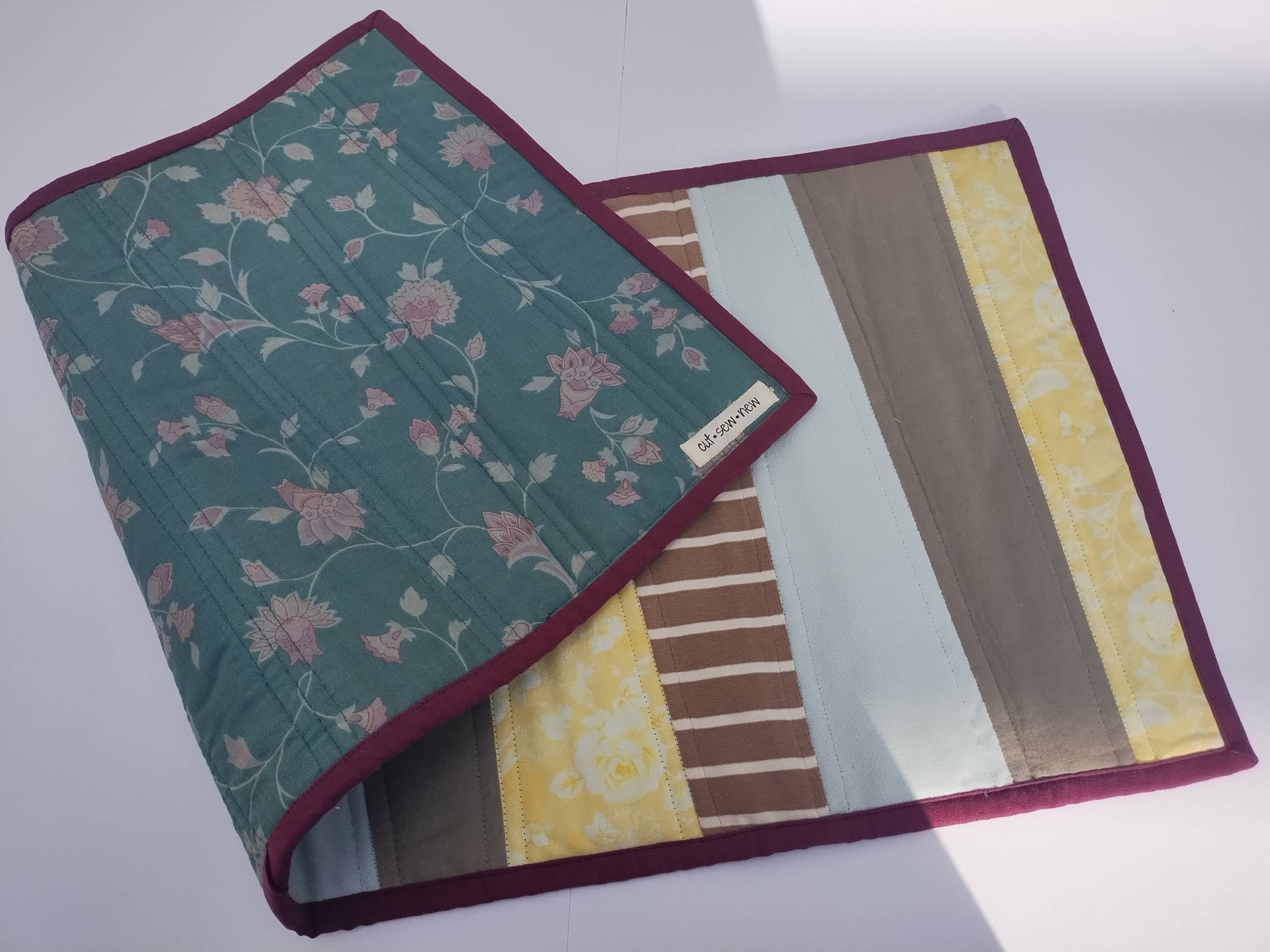 Add a cozy, rustic charm to your dining space with the Desert Bloom Quilted Table Runner. This handmade piece features a warm palette of golden yellow florals, soft blues, earthy browns, and classic stripes arranged in angled panels for a modern twist on a traditional design. Each fabric strip is carefully stitched to create a dynamic, layered look that draws the eye while protecting your table’s surface.